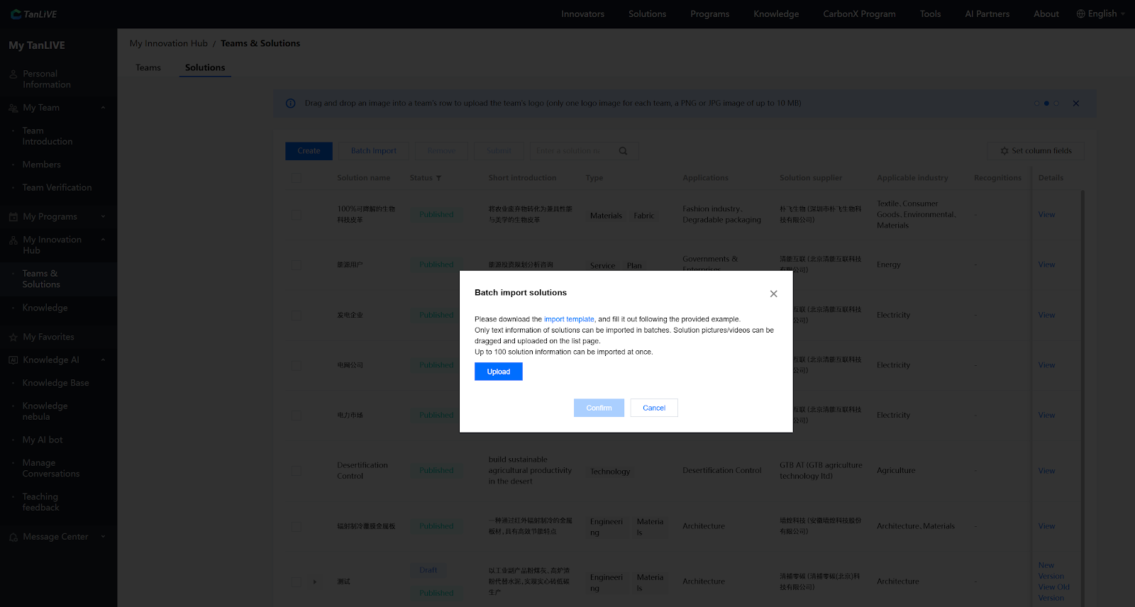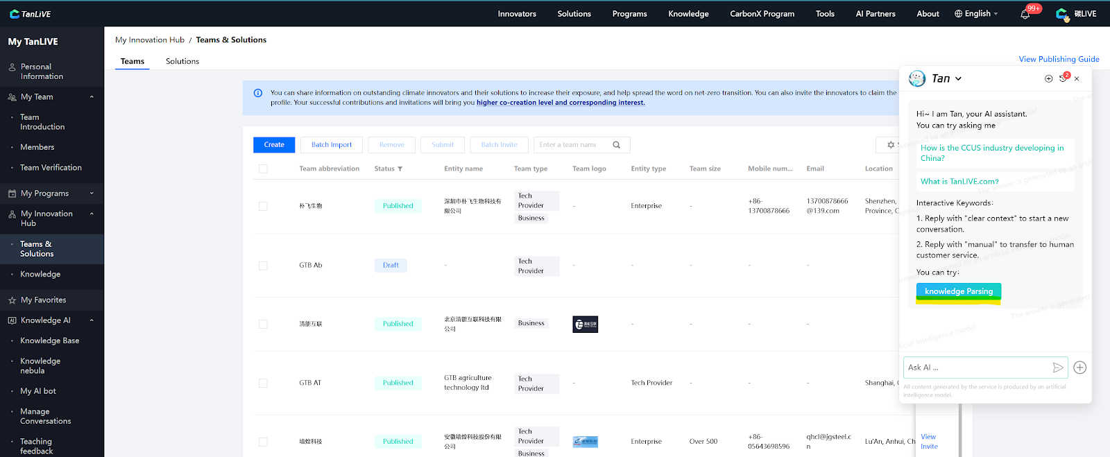 Manual Online/AI Submission | Interactive Webpage | Direct data entry on TanLIVE.com. | Requires account registration and team verification. Used for posting solutions and case studies (“My Solutions,” “My Knowledge”) and then select your posted data to share to the AI bot “CTS Web” |
