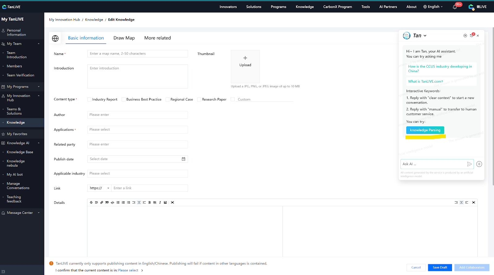 3)AI assisted: If you have a file (E.g. pdf, word) that contains the information of one or more solutions, you can click on the little seal on the right and then click on the button “knowledge parsing,” AI will help you to parse solution information automatically from the file for you and fill out the fields automatically.